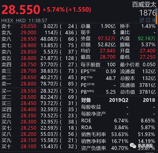 新浪港股讯 9月30日消息,港股又迎来一只巨无霸,曾经在7月上市搁浅的百威亚太(01876.HK)卷土重赖,今日挂牌上市股价高开高走,午盘暴涨近7%,股价高见28.85港元,市值日前突破3800亿港元,折合486亿美元。