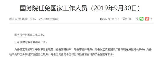 新浪财经讯 9月30日消息,国务院今日发布任免国家工作人员公告,免去王兆星的中国银行保险监督管理委员会副主席职务。