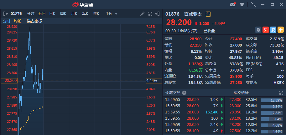 亚洲啤酒王百威亚太首日挂牌港交所,截止收盘涨4.44%,报价28.20港元,若以发行价27.00港元买入,一手赚120港元,成交额73.32亿港元,市值达3788亿港元。