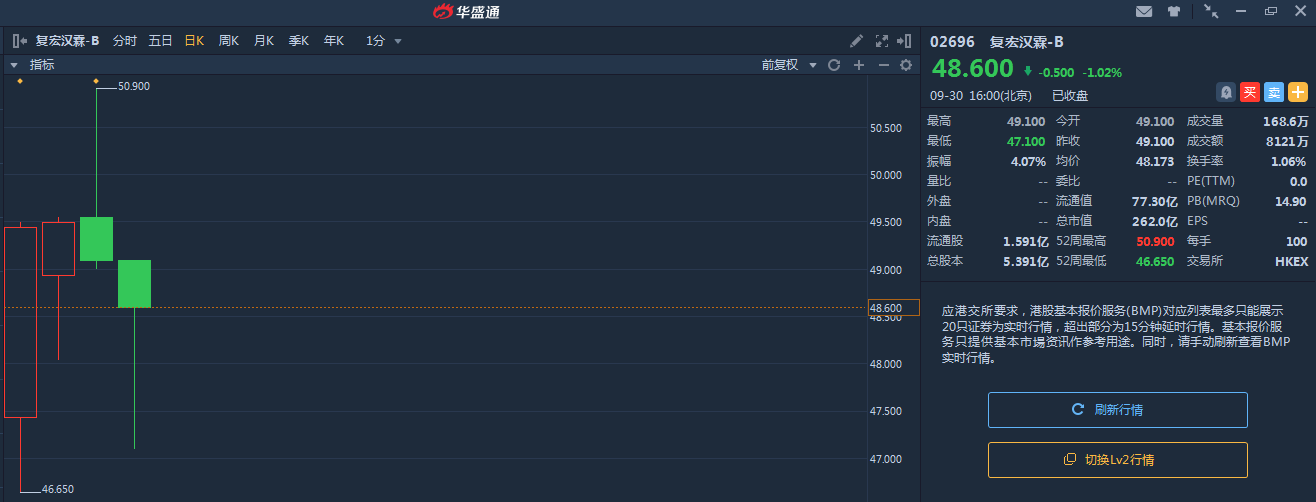 不过复宏汉霖在IPO时成功引入包括CaymanHenlius、卡塔尔主权基金QIA旗下AI-Rayyan、AVICTGlobal、舒泰神投资作为基石投资者,认购29.3%-34.2%的发售股份,占发行后总股本的3.52%-4.10%。同时复宏汉霖对于其保荐券商授出“绿鞋机制”,在9月25-27日盘中都显现了大量机构买单,股价也一度回到49港元上方。