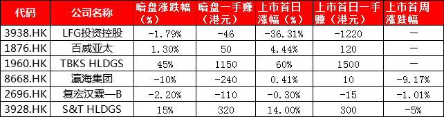 其他股票表现中,新加坡建筑服务商S&T HLDGS表现亮眼,暗盘和首日分别涨15%和14%,一手分别可赚320港元和300港元。百威亚太暗盘涨1.3%,每手可赚50港元;首日收涨4.44%,每手赚120港元。香港金融服务商LFG投资控股则上市遇冷,暗盘跌1.79%,上市首日跌幅更是扩大至36.31%。