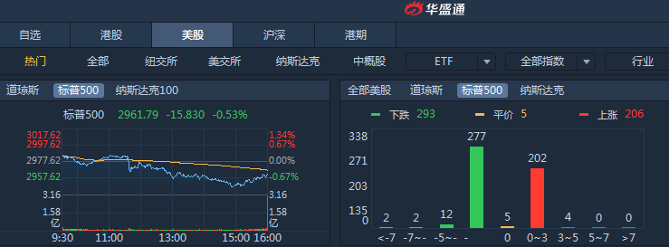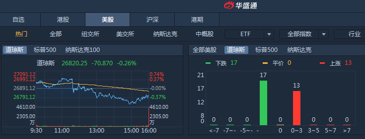 上周五美股集体,道指跌0.26%报26820.25点,标普500指数跌0.53%报2961.79点,纳指跌1.13%报7939.63点。中概股齐现调整,而美金融股收涨。