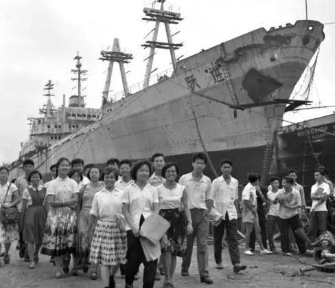 1958年11月27日,中国第一艘万吨远洋货轮“跃进号”下水。图为归国华侨学生在大连造船厂参观正在制造的“跃进号”万吨巨轮(资料照片)。新华社