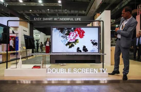2019年9月6日,在德国首都柏林举办的第59届柏林国际消费电子展上,一名参观者在长虹公司展区观看双屏电视。