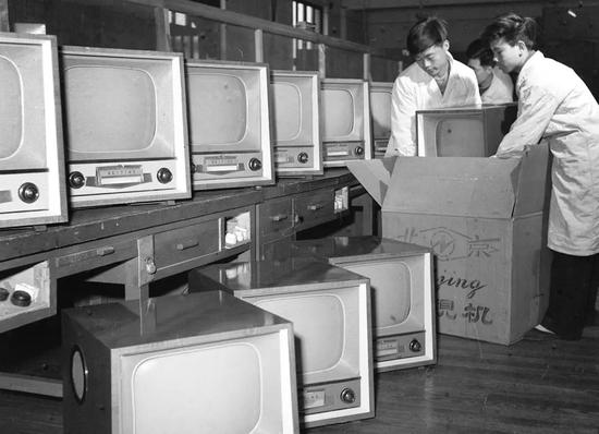 1958年3月17日。天津无线电厂试制出第一台国产电视机。图为正在包装待运的“北京牌”电视机。新华社 田明摄