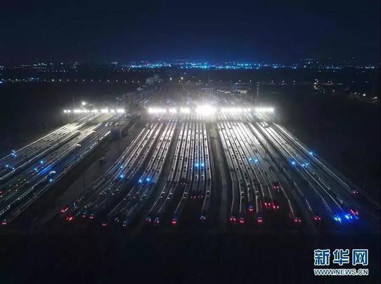 图为在中国铁路北京局集团有限公司北京动车段的存车线上,一辆辆检修完毕的动车组蓄势待发。新华社记者 邢广利 摄,2018年2月1日