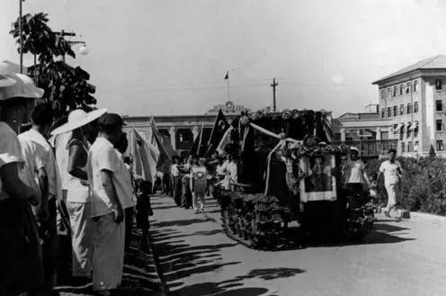 1958年7月20日,中国人自己制造的第一台拖拉机——东方红54履带拖拉机驶出洛阳第一拖拉机制造厂(洛拖)厂门(资料照片)。新华社发