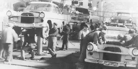 图为1958年8月拍摄的第一批红旗轿车生产线。新华社发(资料照片)