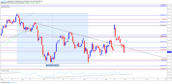 沙特油田遇袭后油价未能突破5月高点63.96,若收盘价跌破54.90(61.8%斐波延展位)-55.60(61.8%斐波回撤位)则面临进一步跌向51.40(50%斐波回撤位)-51.8(50%斐波延展位)的风险,更下方目标看向48.40×38.2%斐波延展位)-49.80(78.6%斐波回撤位)。(David Song撰,Cindy译)