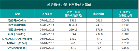 不过,部分海外来港上市的股份,由于投资者对其认识较低,加上部分股份于本港是第二上市,股份流通量低,令股份成交偏低,于本港投资者的关注度不高。由于成交低,亦令其中多家海外企业选择从本港市场退市,其中包括有欧洲奢侈品牌COACH,以及多家海外矿业巨头,包括淡水河谷、哈萨克斯坦矿业及嘉能可。德勤中国全国上市业务组联席主管合伙人欧振兴表示,这是企业多是来港第二上市,加上集资额低,令股东基础窄,成交不足以支持。