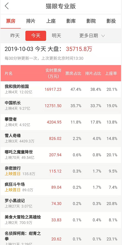 新浪财经讯 10月3日消息,据猫眼专业版数据,截至13:30,《我和我的祖国》累计票房达12.02亿元,《中国机长》累计票房9.27亿元,《攀登者》累计票房4.92亿元。日前,三部影片票房累计已经超过25亿,超过2018年国庆7天总票房。