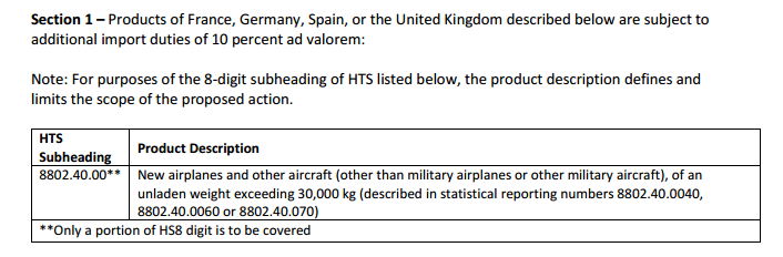 根据上述USTR征税清单可以看出,将面对10%关税产品的是“空载重量超过30,000千克新的飞机和其他飞机(军用飞机或其他军用飞机除外)。”其主要惩罚对象即为空客生产国——英、法、德、西四国。