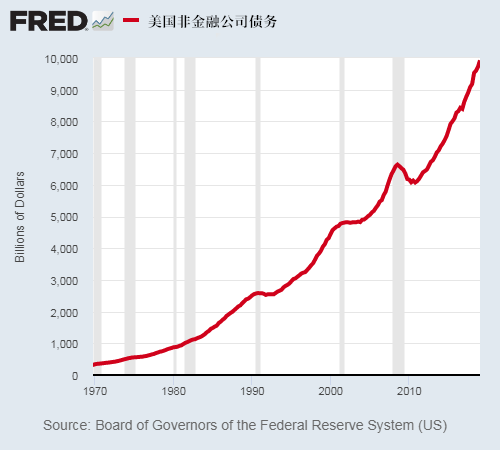 美国大公司的非金融公司债务目前约为10万亿美元,占GDP的48%。这比2008年第三季度的最高峰值(当时公司债务为6.6万亿美元)增长了52%,约占2008年GDP的44%。