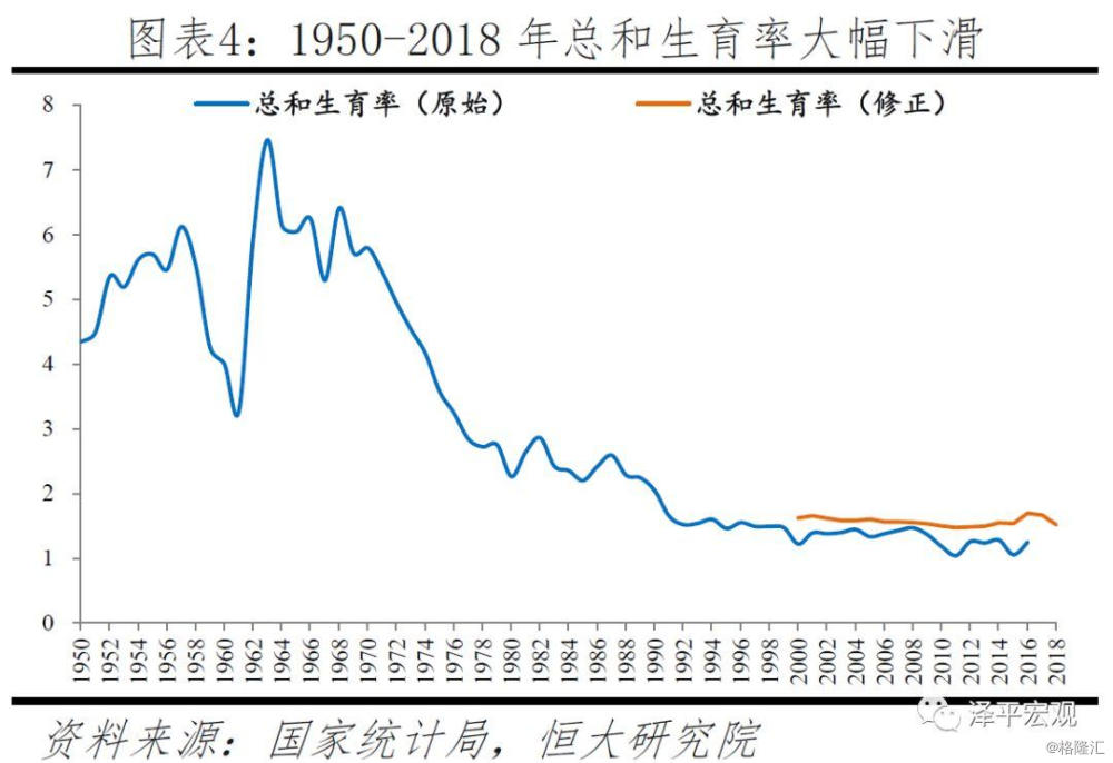1)1949年以来中国出现了三轮婴儿潮,总和生育率从1970年代之前的6左右降至1990年的2左右,再降至2010年后的1.5左右,第四轮婴儿潮因长期严格计划生育未能如期出现。总和生育率指每个妇女一生平均生育子女数,但官方数据存在对低龄人口的漏登导致低估总和生育率。我们基于教育部门的小学生入学数据和漏报率修正了近年总和生育率。第一轮婴儿潮出现在1950-1958年,因新中国成立后人民生活安定、经济恢复发展、医疗卫生条件改善,出生人口年均2100万,峰值接近2300万(1954年),出生率基本在30‰以上,总和生育率平均5.3。1959-1961年三年困难时期,出生人口、出生率、总和生育率均大幅下滑。第二轮婴儿潮出现在1962-1975年,出生人口年均2628万,峰值超过3000万(1963年)。这其中既有三年困难时期过后的补偿性生育因素,也与文化大革命时期计划生育工作受冲击有关。不过,在1970年代“晚稀少”政策下,1970-1977年出生人口从1970年降至1789万,出生率从33‰降至19‰,总和生育率从5.8降至2.8,1980年更是低至2.3。第三轮婴儿潮出现在1981-1991年,出生人口年均2260万,峰值2550万(1987年),出生率大致在20‰-23‰之间,总和生育率平均2.3。之后出生人口逐渐降至2003年的约1600万,官方总和生育率降至1.4左右、修正后约1.6。第四轮婴儿潮应在2010年后出现,但因长期严格执行计划生育而消失,2010年官方总和生育率降至1.18,修正后仅1.5。