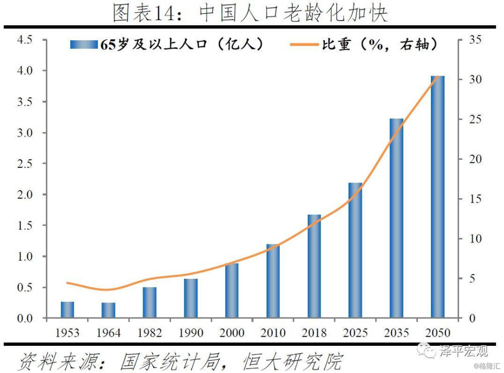 2)人口老龄化加快,养老负担日益加重,2018-2050年中国老人比重将从12%快速升至30%。老龄化是全球普遍现象,但中国由于计划生育老龄化速度前所未有。1970-2015年中国人口年龄中位数从19.3岁快速升至37.0岁,预计2050年将达50岁。从国际看,2015年美国、欧洲、日本、印度人口年龄中位数分别为37.6、41.6、46.3、26.7岁,到2050年将分别为42.0、46.6、53.2、37.5岁。从65岁老年人口占总人口超过7%的老龄化过渡到超14%的深度老龄化,法国用了126年、英国46年、德国40年、日本25年(1970-1994年);从深度老龄化到老年人口占比超过20%的超级老龄化,德国用了36年(1972-2008年),日本用了21年(1995-2006年)。中国2001年65岁及以上人口占比超过7%、进入老龄化社会,2018年占比达11.9%,预计中国将用约22年、即于2023年前后进入深度老龄化社会,再10年后即2033年前后进入超级老龄化社会,2050年达30.0%,老龄化速度前所未有。而且,由于人口基数大,老年人口规模也是前所未有。2018年中国65岁及以上人口已达近1.7亿,预计2050将达3.9亿,届时每3.3个中国人中就有1个65岁以上的老人。