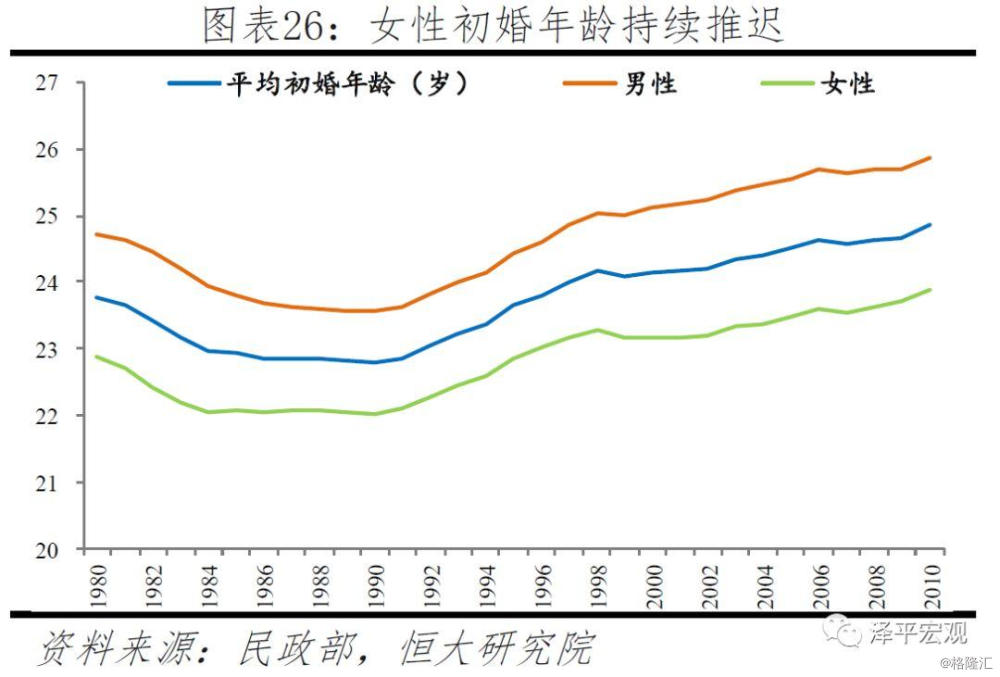 1)中国结婚率2013年见顶后持续回落,离婚率持续攀升;晚婚晚育现象日益突出,1990-2015年平均初育年龄从24.1岁推迟至26.3岁。与美国、欧洲非婚生子女占比高达40%-60%不同,中国非婚生子女占比大约不到10%,因此,中国的生育问题首先是结婚问题。2013年中国结婚登记对数达1347万对,之后持续下滑至2017年的1063万对,粗结婚率从9.9‰降至7.7‰。离婚登记对数从1995年之前的不到100万对攀升至2017年的437万对,粗离婚率攀升至3.2‰。1990-2010年男性平均初婚年龄从23.6岁推迟至25.9岁,女性平均初婚年龄从22.0岁推迟到23.9岁;其中,女性、男性平均初婚年龄分别在1996、1998年超过晚婚年龄(女23、男25岁)。根据民政部统计,2005-2016年20-24岁结婚登记人数(含再婚)占比从47.0%降至24.2%,25-29岁、30-34岁、35岁以上结婚登记人数占比分别从34.3%、9.9%、8.8%增至38.2%、12.8%、24.8%。