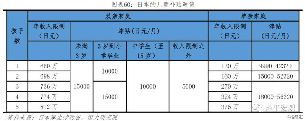 在经济补贴方面,日本生育女性可获得42万日元的一次性生育临时金、以及每月约1万日元的儿童补贴(12岁以下)。日本女性生产可以获得42万日元的一次性生育临时金,养育儿童可获得根儿童补贴。在收入限制内、抚养一个三岁以下的孩子的家庭,每个月可以获得15000日元的儿童补贴;抚养3岁到小学毕业的孩子的家庭,有2个孩子以内的每月可获得10000日元,3个孩子及以上的每月可获得15000日元等。
