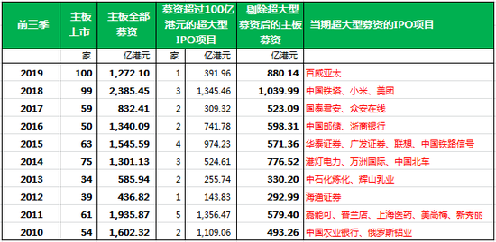 由于超大型募资(募资金额超过100亿港元)的IPO项目每年只有几家,所以我们在计算主板募资表现时,剔除了超大型募资的 IPO 项目。按剔除超大型募资项目后的募资金额来看,2019年前三季的募资金额为 880.14亿港元,在过去10年的同期比较中,仅次于2018年的1,039.99亿港元。