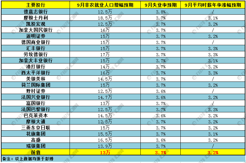 分析师预估中值显示,美国9月非农就业人数料增加14万,略高于前月13万的增幅,失业率可能保持在3.7%,平均每小时工资环比增速或放缓。