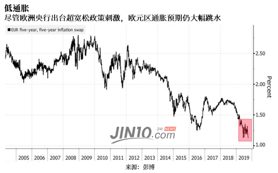 不仅是美国,欧洲市场也发出了类似的悲观气氛。欧元区物价压力的长期指标正在下滑:衡量未来十年通胀预期的5y5y掉期利率正跌至历史低点,引发了市场和欧洲监管者对通缩的担忧。欧洲央行管委维斯科本周四表示,欧洲央行不能冒失去对通胀预期控制的风险,并称更严重的风险是“国债高企的情况下出现通缩”。