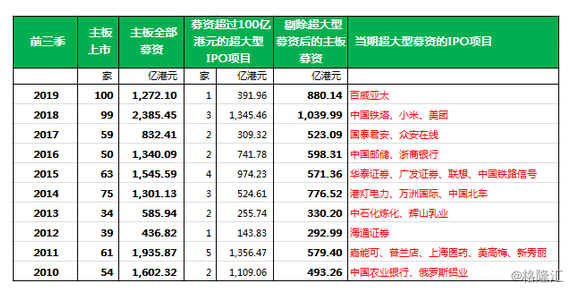 由于超大型募资(募资金额超过100亿港元)的IPO项目每年只有几家,所以我们在计算主板募资表现时,剔除了超大型募资的 IPO 项目。按剔除超大型募资项目后的募资金额来看,2019年前三季的募资金额为 880.14亿港元,在过去10年的同期比较中,仅次于2018年的1,039.99亿港元。就2019年主板市场的表现来看,我们认为香港资本市场依然火热,香港仍然是中国内地企业上市的首选地之一。