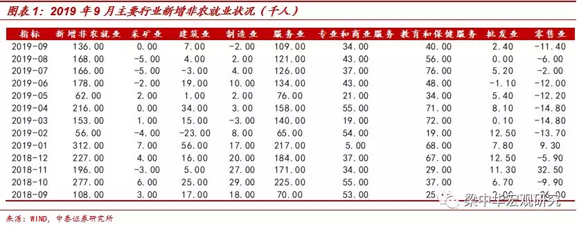 具体来看,商品生产中制造业新增就业由正转负为-0.2万人,为今年4月以来新低,今年以来月度均值仅为0.5万,远低于18年月度均值2.2万,成为非农就业的主要拖累;建筑业表现回暖,而采矿业连续3个月负增长后,本月几乎无增长。服务业中专业和商业服务以及教育和保健服务新增就业人数依旧表现抢眼,今年以来月度均值分别达到3.5万和5.4万;而零售业已经连续8个月负增长,批发业持续低迷,批零就业持续低迷是服务业就业的主要拖累。