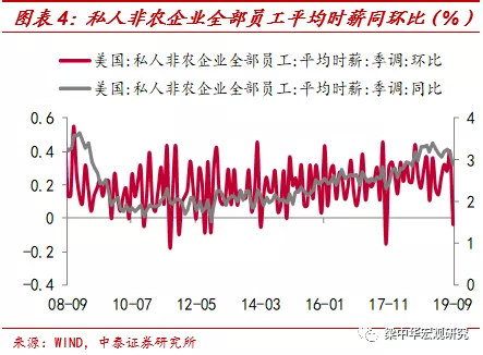4、薪资小幅回落。9月美国私人非农企业员工平均时薪环比为-0.04%,较8月小幅回落0.4个百分点,为2017年10月以来最低水平;而同比为2.9%,也较上月回落0.3个百分点,是2018年7月以来新低。私人非农就业岗位上所有员工的平均小时收入在9月份下降了1美分,达到28.09美元,而8月份则增长了11美分。9月美国私人非农企业员工平均每周工作小时小幅为34.4小时,与上月持平。