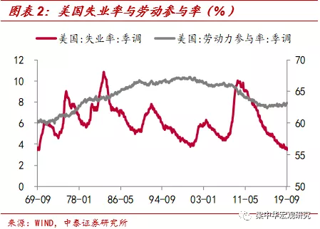 9月美国新增非农就业人数13.6万人,不及市场预期的14.5万人,并且8月份数据和7月份数据也分别上修为16.8万人和16.6万人。今年以来新增非农就业人口月均仅16.1万人,较2018年月均的22.3万人出现下滑,并且过去3个月美国新增非农就业人口月均仅15.7万人,就业人口的缓慢增长表明美国整体已经实现充分就业。