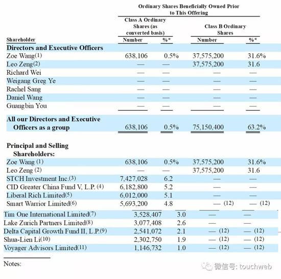 Tim One International Limited持有3%的A类普通股;Lake Zurich Partners Limited持有2.6%的A类普通股;Delta Capital Growth Fund II, L.P.持有2.1%的A类普通股;Shua-Lien Li持有1.9%的A类普通股;Voyager Advisors Limited持有1%的A类普通股。
