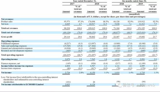 易恒健康2017年、2018年净利分别为272万美元、615万美元;易恒健康2019年上半年净利为172万美元,净利润率为1.1%;易恒健康2018年上半年净利为103万美元,净利润率为1.4%。