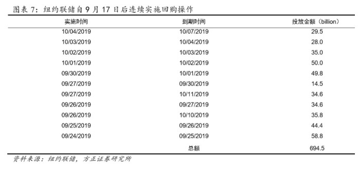 对此,纽约联储连续多日实施回购操作(图表7),总投放规模接近7000亿美元,缓解市场短期流动性压力。此举增加了纽约联储日常公开市场操作难度,同时为达到长期效果美联储有可能在10月会议上提出重启扩表。