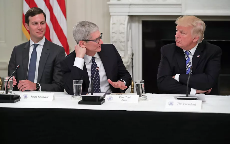 2016 年 12 月,刚刚当选美国总统的特朗普(Donald Trump)在纽约会见了一批美国科技界的精英企业家,Tim Cook 也应邀参加会见。当时,由于苹果公司内部对特朗普当选的反对情绪,有员工对 Tim Cook 出席会见的重要性表示怀疑,对此,Tim Cook 回应称: