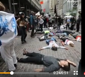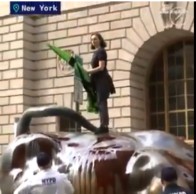 当时,这些环保主义人士向华尔街铜牛泼“假血”,一人站在铜牛上挥舞旗帜,多人躺在地上装死,以示对美国金融界的不满,共有93名参加抗议活动的人士被警方逮捕。