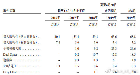 按每月活跃用户(月活)算,鲁大师占个人电脑及移动设备的市场份额高达98.8%及58.9%。公司今年4月产品总月活约为1.25亿,其中多款软件产品月活达1.2亿,剩下游戏库拥有490万月活。