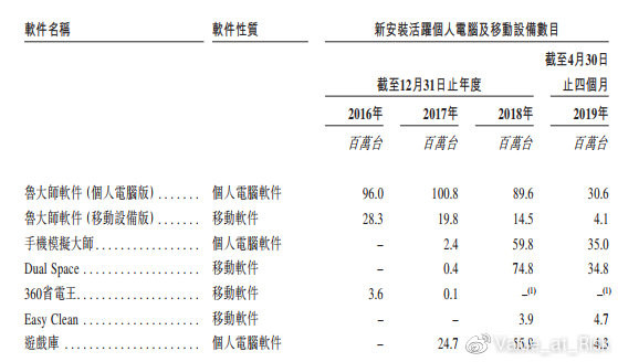 PC端360鲁大师软件的装机量在17年见顶后出现下滑,不过月活用户数仍在不断增长(16年至19前四个月:分别为4000万人、5500万人、5900万人及6600万人)。移动版的360鲁大师装机量和月活则同步下滑。
