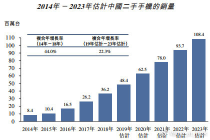 中国二手手机销量由2014年的8 .4百万台增至2018年的36.2百万台,复合年增长率为44%。二手手机的收益自2014年的人民币224亿元增至2018年的人民币1,031亿元,复合年增长率为46.5%。预期二手手机收益将进一步增至2023年的人民币3,581亿元,复合年增长率为26.0%。二手手机市场的预测乃基于以下各项:(1)2019年至2023年手机总数量预计不断增加;(2)随着检测技术及市场监管的改善,中国二手手机交易市场日益规范化;及(3)愿意选择二手手机(而非新手机)的消费者比例将持续增加,主要由于(i)二手手机选择预计呈现多元化;(ii)二手手机较新手机具有价格优势;及(iii)二手手机被年轻买家广泛接受。二手手机的主要目标客户通常具有相对较高的消费能力,月薪超过人民币8,000元。二手手机的目标客户主要为年龄为20至35岁并愿意接受新观念及生活方式的客户。彼等通常频繁升级其手机并对价格较为敏感。