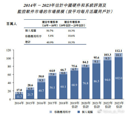除鲁大师外,个人计算机硬件和系统评测及监控软件市场的其他主要参与者包括PCMark及Geekbench。移动电子产品硬件和系统评测及监控软件市场的其他主要参与者包括安兔兔、Geekbench及3Dmark。过去五年,硬件和系统评测及监控软件市场的市场规模增长迅速。由于99%以上的硬件和系统评测及监控软件用户为个人用户,硬件和系统评测及监控软件市场规模通常按平均每月活跃用户及每日活跃用户计算。就个人计算机而言,硬件和系统评测及监控软件的平均每月活跃用户由2014年的11.7百万人增加至2018年的60.1百万人,复合年增长率为50.7%。2018年的硬件和系统评测及监控软件用户的渗透率(按中国个人计算机平均每月活跃用户数除以个人计算机网络用户总数计算)为12.2%,仍有增长空间。就移动电子产品而言,硬件和系统评测及监控应用程序的平均每月活跃用户由2014年的5 .3百万人增加至2018年的6.6百万人,复合年增长率为5.8%。