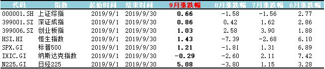核心指数层面,9月表现中规中矩,上证综指结束2个月来的下跌,录得0.66%涨幅,创业板指涨幅连续三个月收窄。恒指亦在局势缓和后迎来小幅上涨。A股方面5G、消费电子、半导体板块表现靓丽,美股市场指数继续在高位徘徊,风险处于历史顶部。