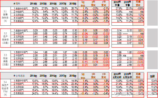 4. 新奥能源净利润率走弱,但资产周转率行业内最优,同时采用了更激进的杠杆率,也可以维持两位数的ROE
