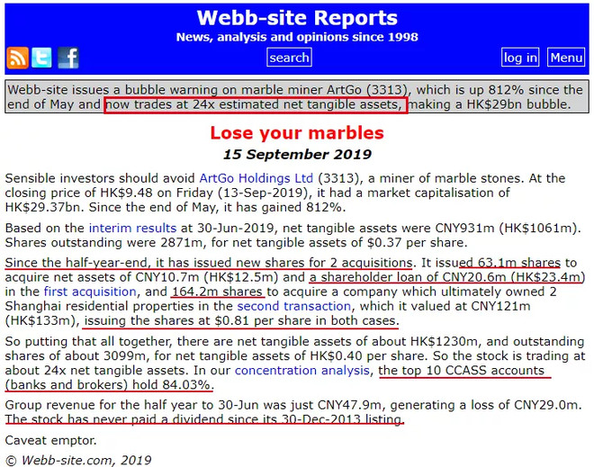 David Webb近日再度发声,在自家网站发文提醒投资者警惕雅高控股(3313.HK)的股价泡沫。根据某券商客户端的描述,雅高控股为一家大理石全产业链品牌运营商,因而文章标题《lose your marbles》结合具体内容也就显得十分戏谑,简单粗暴地翻译,