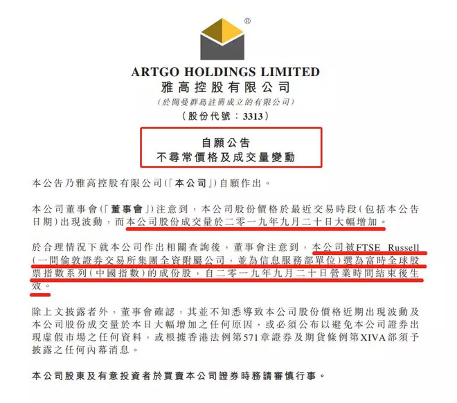 更加有趣的是,雅高控股背后的大佬们完成收割后,还堂而皇之地发布公告,颇具几分挑衅的意味。根据公告内容,雅高控股在9月20日(星期五)临近全天收盘时刻成交量异常放大的原因是公司被富时指数纳入成分股,除此之外并无其他原因。
