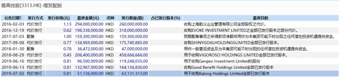 其次,如果我们假设这场收割大戏真的在2016年就已经开始策划,那么根据3年间累计发现的股票,大佬们手中总计持有17.65亿股,平均成本价0.74元/股。并且,这还是非常非常保守的统计,一是代价发行收购的资产有可能是垃圾资产,甚至是空壳公司;二是从雅高控股仅3年的经营概况看,即使是配股募集的资金,都有可能通过其他手段转回自家口袋。