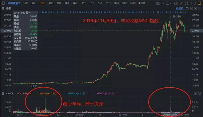 2018年11月30日,MSCI指数半年度调整生效前一个交易日,临近全天收盘港股市场多只股票成交量骤然放大,其中就包括一年半时间股价暴涨33倍的中国鼎益丰(0612.HK)。