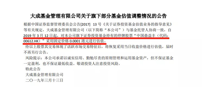 而至于接盘的被动型基金,也不过就是跟大成基金同一个操作,将组合里鼎益丰的资产按照0.0001港元估值。