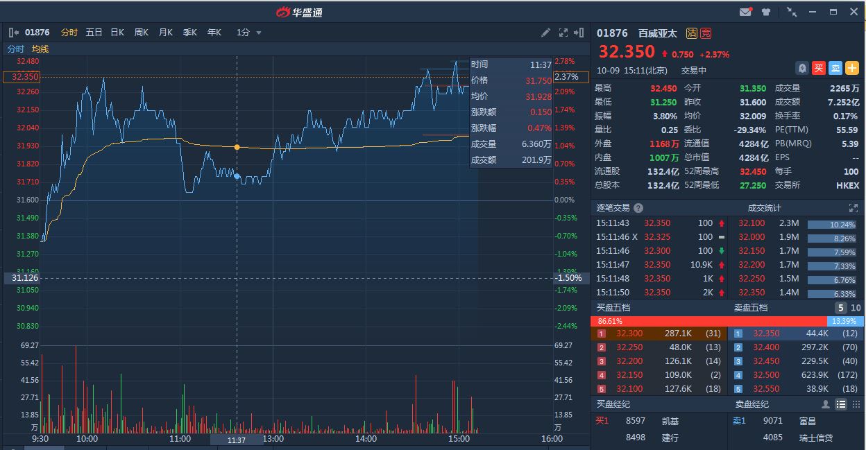 格隆汇10月9日丨自9月30日上市以来,百威亚太(1876.HK)股价持续上扬,不断创出上市以来新高价,现报32.35港元,涨2.37%,盘中最高价为32.45港元,为上市以来新高,现价较招股价27港元涨19.8%,最新总市值4284亿港元,相当于6个青岛啤酒或3个华润啤酒。