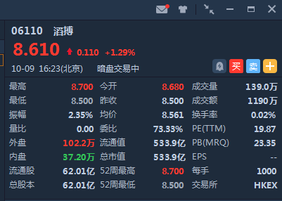 滔搏暗盘高开2.11% ,截止16:24,暗盘段报8.61港元,较发行价8.50港元涨1.29%,暂成交1190万港元,最新总市值533.9亿港元。