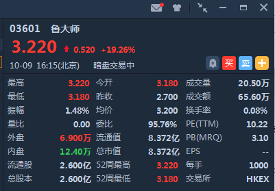 鲁大师暗盘高开17.77% ,截止16:15,暗盘段报3.220港元,较发行价2.70港元涨19.26%,暂成交65.6万港元,最新总市值8.372港元。