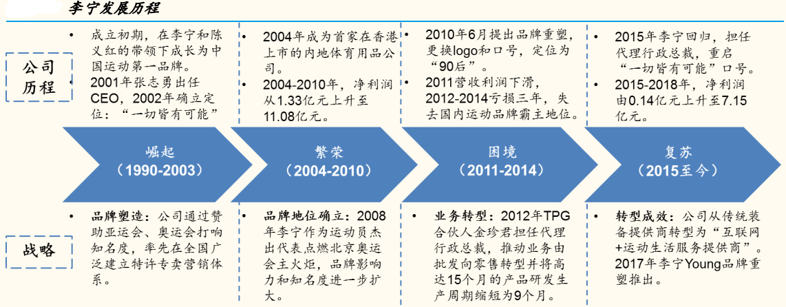体操王子李宁在赛场上取得了无数的世界冠军和奥运金牌,而这也为他在创办品牌,快速成长为中国体育用品龙头起了重要作用。在1990年至2003年期间,在李宁(第一任 CEO)和陈义红(第二任 CEO)的带领下,公司通过赞助亚运会、奥运会打响知名度,率先在全国广泛建立特许专卖营销体系。2001年张志勇出任公司第三任CEO,2002年确立品牌定位:“李宁,一切皆有可能”。