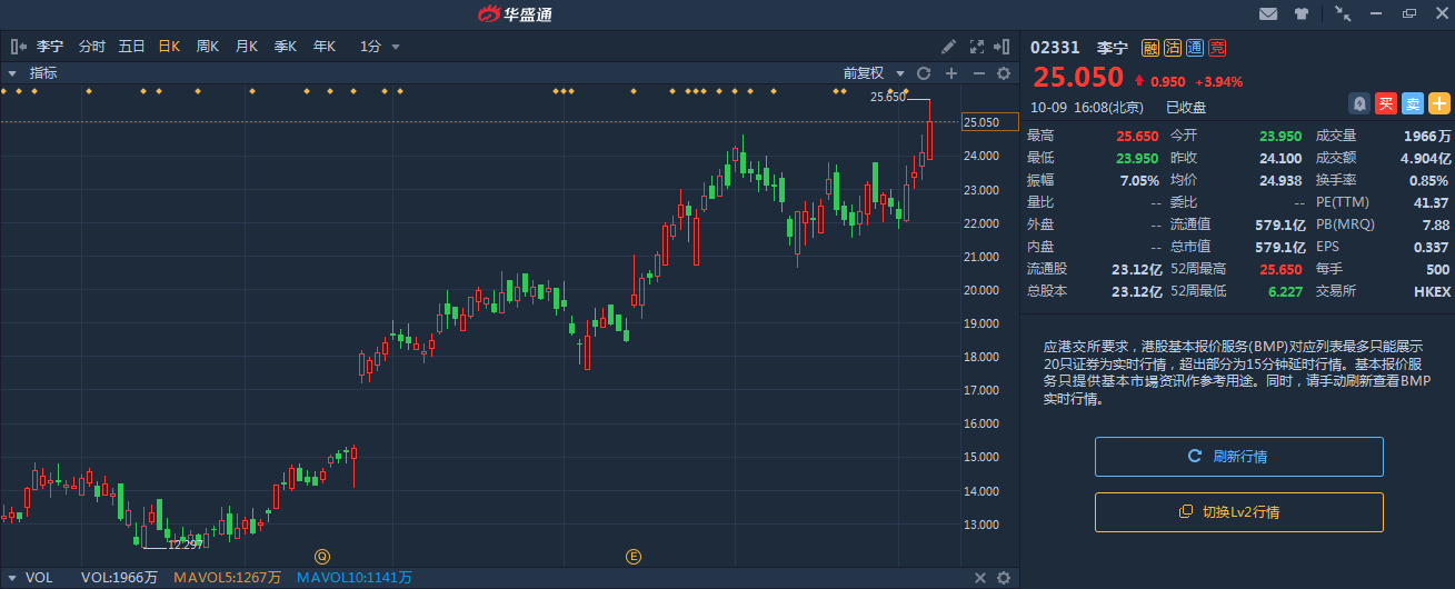 不过另一边厢,收到消息刺激,与CBA(中国男子篮球职业联赛)有关的股票却迎来大涨。除了粤宏远、浙江广夏这些A股以外,港股市场最强当属运动品牌李宁。作为CBA官方战略合作伙伴,李宁在10月9日最高价达到25.65港元,创下9年以来新高,2019年以来的最大涨幅超过200%!
