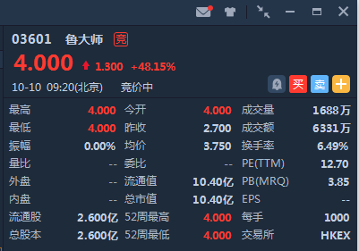 鲁大师首日挂牌,截至9时30分,涨48.15%,报价4.00港元 ,成交额6331万港元 ,最新市值10.40亿港元。